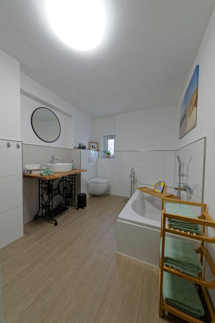 Badezimmer mit ebenerdiger Dusche und Badewanne. Ein Schlafzimmer mit Doppelbett und ein Schlafzimmer mit einem Hochbett (Liegefläche unten 140cm, oben 90cm).