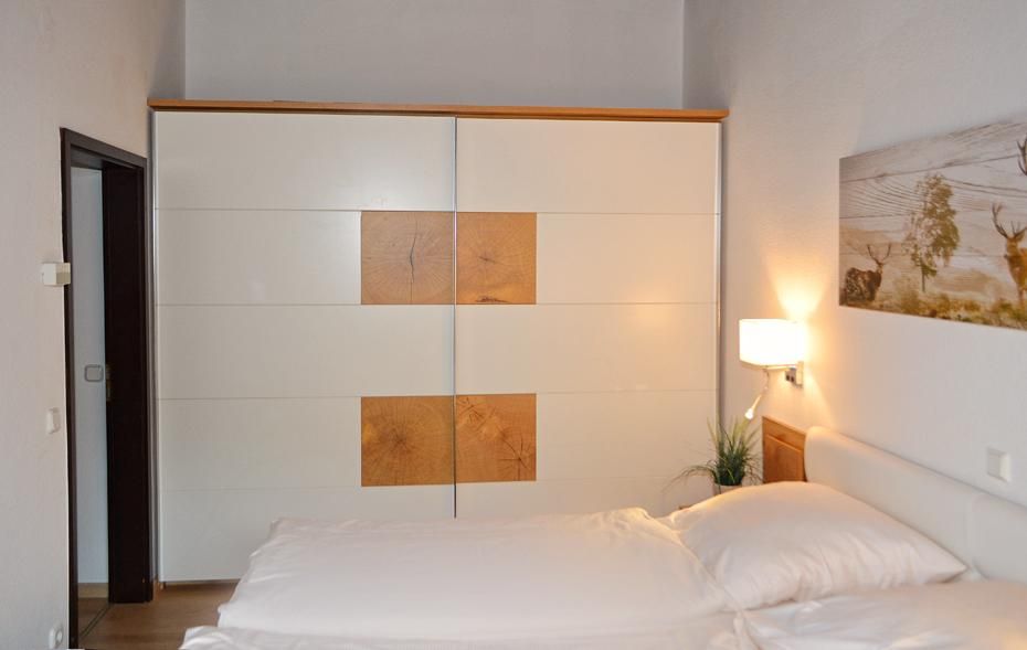 - Ein Schlafzimmer mit fußoffenem Doppelbett und TV